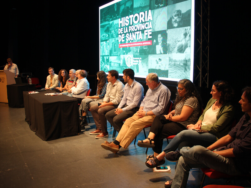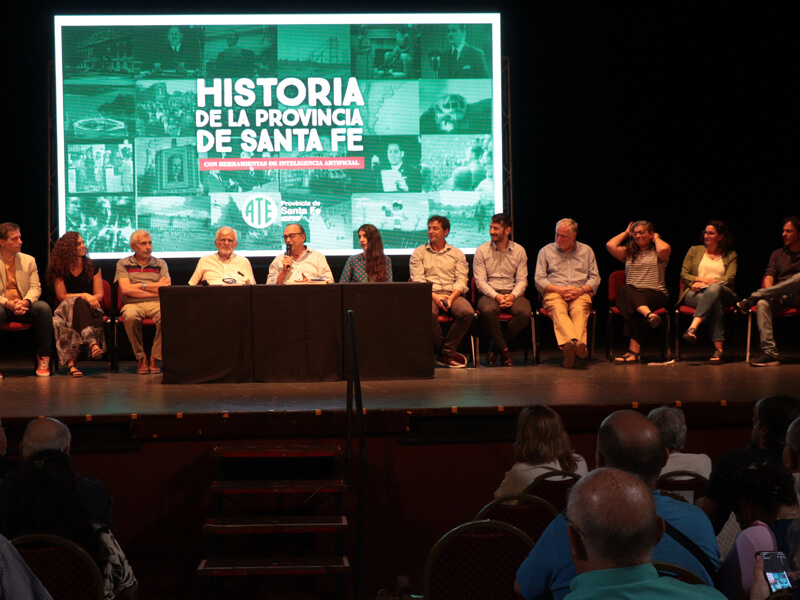 La presentación de la integración de la Inteligencia Artificial a la Megaproducción “Historia de la Provincia de Santa Fe” tuvo lugar en un evento realizado en el Centro Cultural ATE Casa España. Dieron el recibimiento a los participantes integrantes del Consejo Directivo Provincial, Silvia González, Ana Laura Gorosito, Adolfo Avallone, Marcelo Delfor y Jorge Hoffmann.