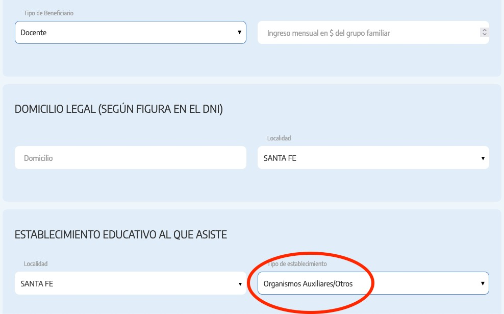 Los asistentes escolares tendrán esta nueva opción en el campo “Establecimiento al que asiste” de seleccionar Organismos Auxiliares / Otros. Allí están incluidos los Centros de Educación Física (CEF), los Talleres de Educación Manual, las Cocinas Centralizadas y también las Bibliotecas Pedagógicas.