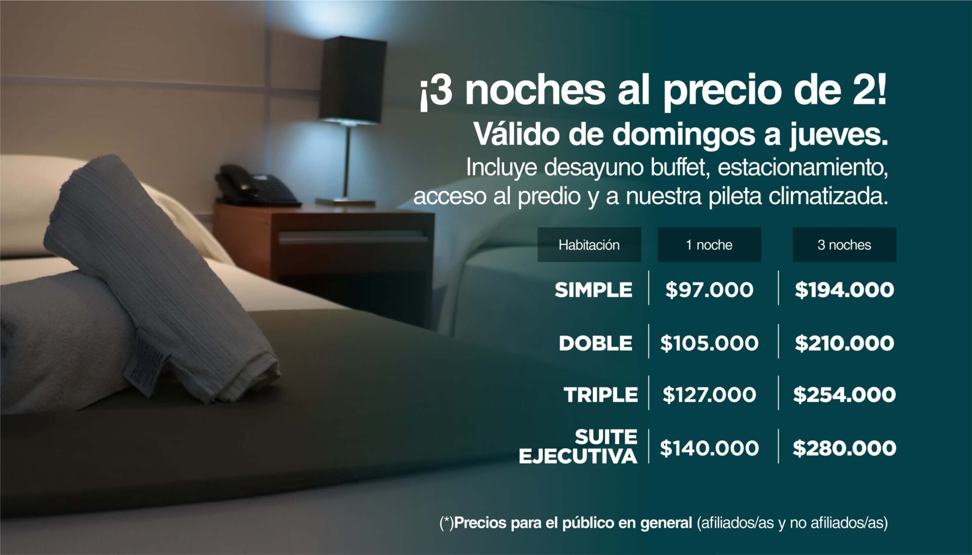 En septiembre, continuamos con una oferta imperdible: tres noches al precio de dos. Válido de domingos a jueves. Incluye desayuno buffet, estacionamiento, acceso al predio y a nuestra pileta climatizada.