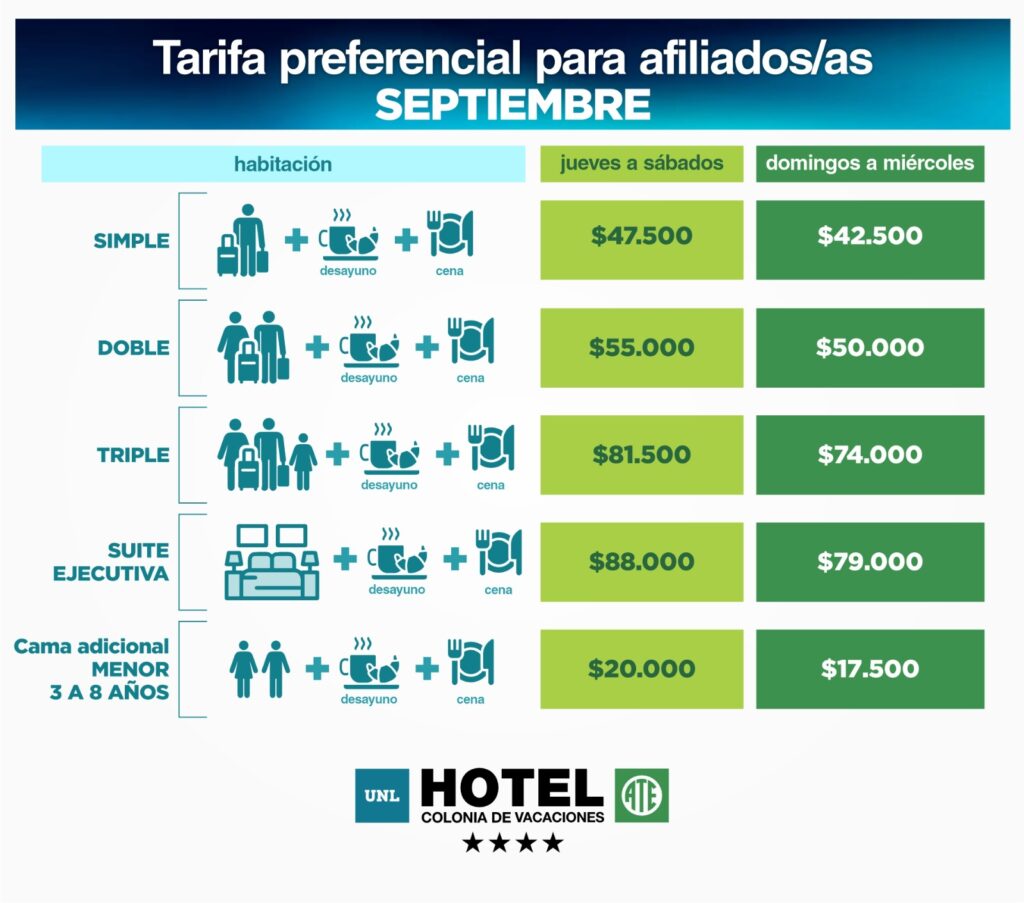 Tarifas vigentes a partir del 1/09/2024: $55.000 para 2 personas por día. Adicional por cama extra para menores de 3 a 8 años: $20.000