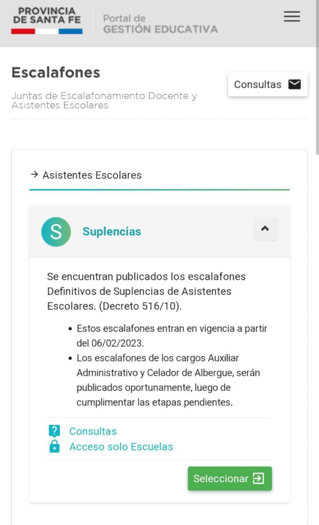También podes acceder en forma directa desde Gestión Educativa, ingresando aquí. Desde este sitio, cada aspirante podrá acceder a los escalafones, además de poder realizar consultas referidas al escalafón. Por otro lado, las escuelas podrán acceder a más información útil haciendo click en los íconos de la imagen al pie.
