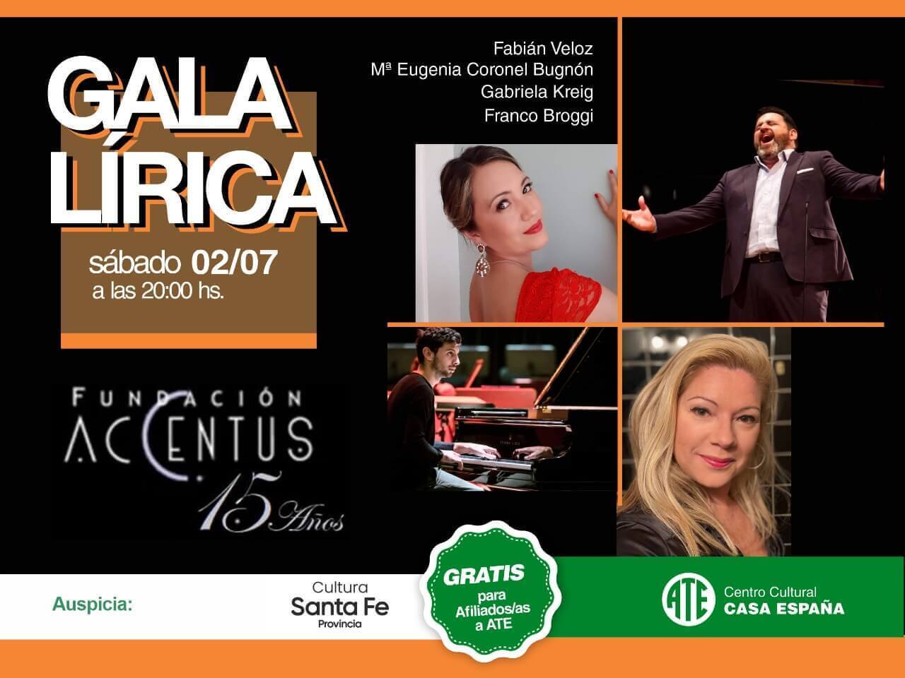 El sábado 2 de Julio a las 20:00 hs en la Sala Mayor del Centro Cultural ATE Casa España (Rivadavia2871), se podrá disfrutar de una excepcional Gala Lírica al celebrarse el 15º Aniversario de Fundación Accentus. Se contará con la presencia del destacado barítono argentino, Fabián Veloz junto a la Soprano María Eugenia Coronel Bugnon, la Mezzosoprano Gabriela Kreig,y el pianista Franco Broggi.