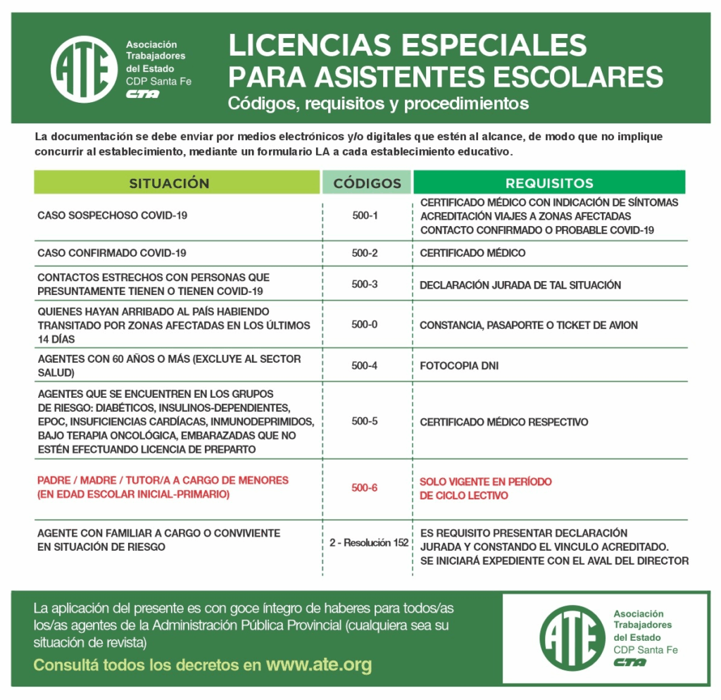 Los trabajadores/as Asistentes Escolares que no estén con Licencia Anual Ordinaria podrán solicitar, en caso de ser necesario, la licencia por los códigos Covid que detallamos a continuación. Las mismas deberán ser acreditadas con la correspondiente documentación respaldatoria.