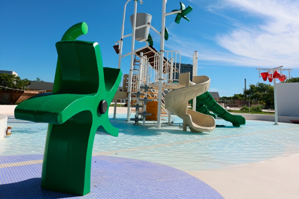 - Mangrullo Acuático: Se trata de una estructura de dos pisos que invita a la aventura y el juego. Cuenta con tres toboganes de distintas alturas y recorridos para que las y los niños elijan su favorito, una palestra que permite escalar de manera segura, un gran balde de agua que se llena y se vuelca de forma sorpresiva generando diversión, y una flor aspersora que refresca el espacio con un suave rocío.