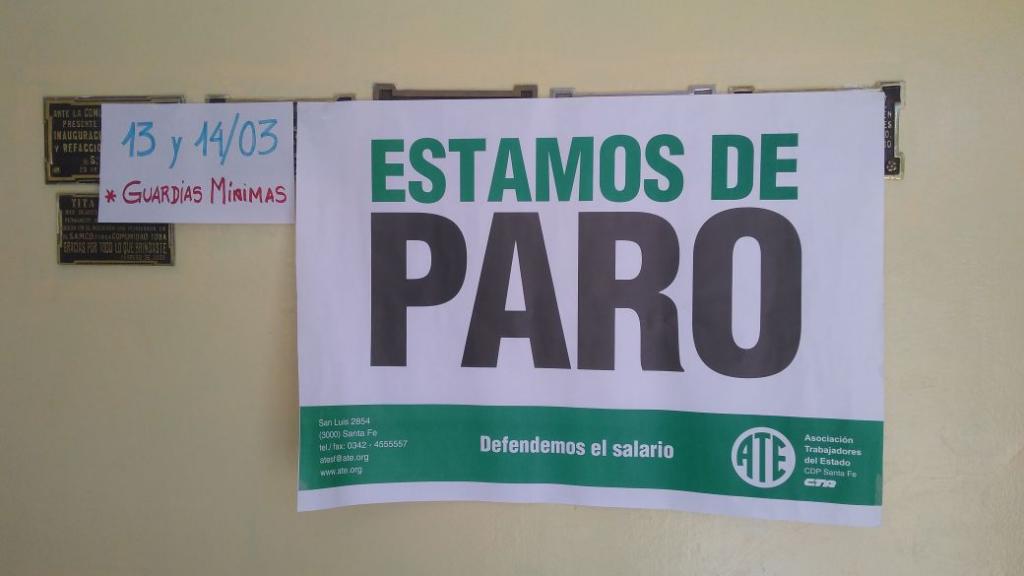 Tal como lo definió el Consejo Directivo Provincial de la Asociación Trabajadores del Estado -ATE- Santa Fe y junto al cuerpo de Delegados, se cumple este martes 13 el primer día de paro sin concurrencia a los lugares de trabajo garantizando las guardias mínimas.
