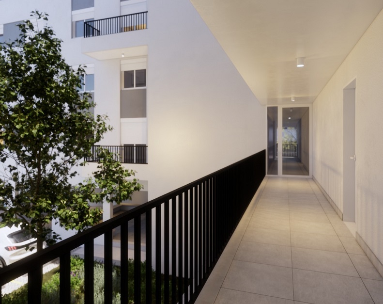 En todos los pisos se repite el tramo de circulación abierta, próximo al acceso a la circulación vertical que permite tener siempre a la vista el espacio social de encuentro de la planta baja. Esto es muy significativo, principalmente después de haber experimentado estos años de aislamiento donde se volvió a poner en valor los espacios abiertos en las viviendas y el patio.